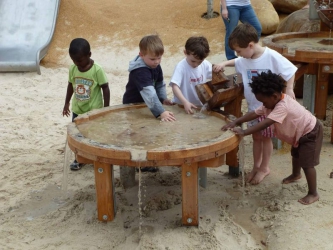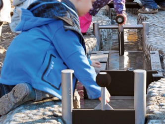 "Watervoorziening" staat meestal in het middelpunt van een waterspel. Een ideaal toestel, om water van een lager naar een hoger niveau te brengen, is de archimedesspiraal, het oude principe van de waterschroef. Door de draaibeweging schept de spiraal bij elke rotatie water uit het schepbekken beneden; het water schroeft zich omhoog in de spiraal en wordt uitgegoten in het stortbekken boven. Dit natuurfenomeen wordt aandachtig geobserveerd en gebruikt voor het transporteren van water.