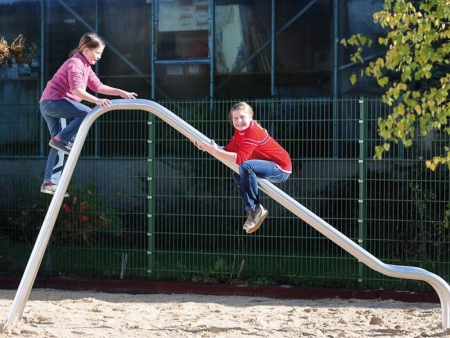 De jacobsladder is een bijzonder glijelement: hij staat luchtig en filigraan onder de blauwe hemel en leidt de kinderen de hoogte in, maar begeleidt ze ook weer terug naar beneden met de nodige speelpret.