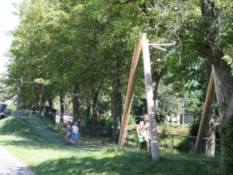 De goed gevormde metalen poorten van de kabelbaan met een grote boog zijn echte blikvangers. Door een flinke aanloop te nemen en dan op het pendelzitje te springen is er een snelle beweging aanwezig. Dit wekt de vreugde bij de kinderen al snel op. Er komen genoeg bewegingen van pas om te spelen rondom de kabelbaan.