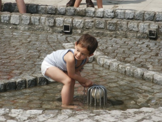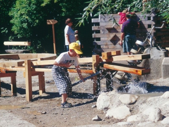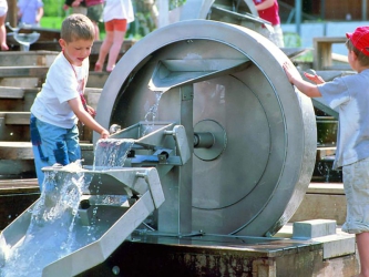 "Watervoorziening" staat meestal in het middelpunt van een waterspel. Een ideaal toestel, om water van een lager naar een hoger niveau te brengen, is de archimedesspiraal, het oude principe van de waterschroef. Door de draaibeweging schept de spiraal bij elke rotatie water uit het schepbekken beneden; het water schroeft zich omhoog in de spiraal en wordt uitgegoten in het stortbekken boven. Dit natuurfenomeen wordt aandachtig geobserveerd en gebruikt voor het transporteren van water.