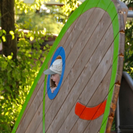 De grote vis die net opduikt uit het water heeft door zijn vriendelijk uitstraling een grote aantrekkingskracht op kleine kinderen. Zij kunnen via een trap of hellend toegangspad de speelvloer bereiken en door de grote "patrijspoorten" de omgeving observeren. Op de brede glijbaan kan men ook met twee tegelijk genieten van de glijpartij. De buik van de vis onder de vloer kan gebruikt worden als speelhuisje of schuilplaats.