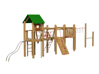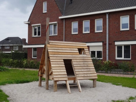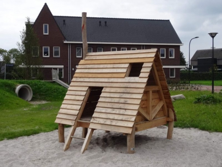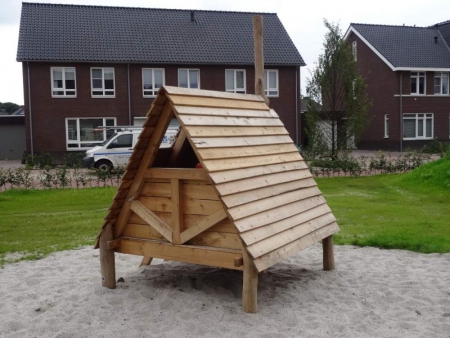 Het robinia paalhut is een speelhut op steunpalen. Het biedt alle speelmogelijkheden van het kleine speelhut, maar heeft een hogere speelwaarde dankzij de tweede speelverdieping. De benedenverdieping nodigt uit tot bouw- en avonturenspelen. Zij doet evenwel ook dienst als kelder of stal van het familieleven dat zich afspeelt op de bovenverdieping. Verschillende paalhutten, op een heling of talud geplaatst, vormen een klein camping gevoel en zodoende een avontuurlijke speelwereld.