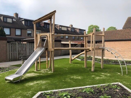 Deze veelzijdige torencombinaties nemen slechts een kleine ruimte in, maar ze bieden een scala aan bewegingsactiviteiten. De esthetische driehoektoren harmonieert uitstekend met de diverse aanbouwtoestellen. Hij kan tegelijkertijd een toevlucht, een vesting of een klauterobject zijn; de kleine ruimten bieden geborgenheid en bescherming. Via verschillende toegangen kan men het uitkijkplatform bereiken. Langs de glijbaan komt men op een prettige manier weer op de begane grond. De aanbouw- en verbindingstoestellen hebben een verschillende moeilijkheidsgraad en ze sporen aan tot gevarieerde spelen.