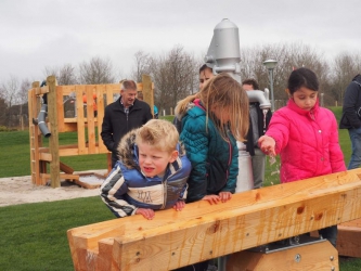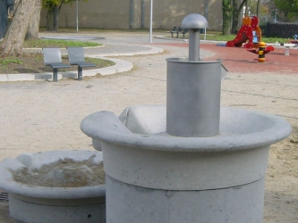Het water dat uit de kop van de vulkaan spuit kronkelt zigzaggend als een lavastroom via de bergflanken naar beneden om hierna te botsen op zandhindernissen en takkenbarricades die kinderen hebben aangebracht. Beneden in de zandbak wordt elke uitbarsting met spanning verwacht. De kleine vulkanologen kunnen natuurlijk ook op de vulkaan klimmen en naar beneden glijden.